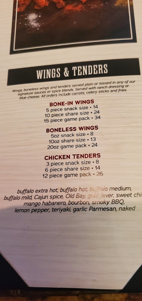 Buffalo Extra Hot • Mango Habanero • Buffalo Hot • Nashville Hot • Buffalo Medium • Cajun Spice • Gold Fever • Sweet Chile • Buffalo Mild • Honey Chipotle• Mesquite BBQ • Lemon Pepper • Teriyaki • Garlic Parmesan • Naked